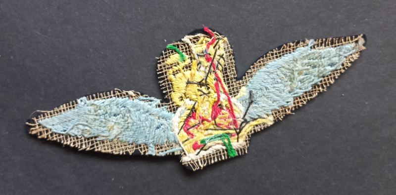This is a neat example of a un-issued flat type British Army Flying qualification wing also known as 'Glider Pilot wing'. The wing was introduced in late 1942 for Staff Sergeants, first class pilots and Officer pilots. The wing has a large light blue wing on either side of a royal crest on black background. There are some variations known on a khaki background and in bullion. This example is a big flat type and measured 12.5 cm across and is further in a perfect and un-issued condition. A wing that is difficult and harder to get these days. A nice little British airborne badge.