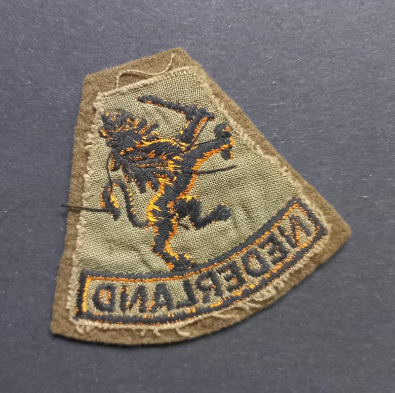 This is a neat example of a nice wartime British made Dutch Free Forces arm i.e formation lion. The lion was worn by all members of the Netherlands Army (Allied forces) what was later renamed as the Royal Netherlands Brigade. The Brigade was part of 21st Army Group and took part in the liberation of Western Europe and the Netherlands. The badge worn by all Netherlands troops on the left upper arm of their Battle Dress and when the Netherlands Army was re-formed the 'NEDERLAND' on the badge was replaced by 'JE MAINTIENDRAI', the motto of the House of Orange. This example is made of green felt and has a green cloth backing.